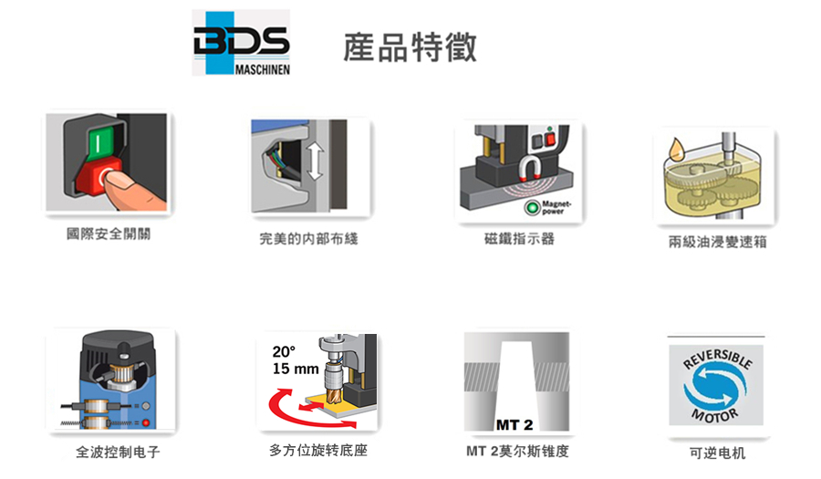介紹:德國制造MAB 485 SB磁力鉆是ProfiPLUS類磁力鉆的最佳介紹 - 具有旋轉底座調節功能。在進行鉆井工作時無意中或在水平情況下對操作員進行有形的減輕。一個好主意變為現實:BDS現在提供四種磁力鉆,具有兩種性能類別的可移動磁力調節功能。旋轉底座的工作原理:將磁力鉆大致放置到位,激活磁鐵,釋放調節功能并輕松調節。旋轉底座使鉆頭能夠放置在正確的位置,而無需同時保持磁力鉆的整個重量。即使磁力鉆用鏈條固定,這種浮雕也是工作安全性的另一個因素。 MAB 485旋轉底座磁力鉆的優點連續電子控制電機輸出和速度,鉆芯和麻花鉆,counters孔,鉸孔,螺紋切削。兩級齒輪箱,非破壞性的油浴變速箱。帶有旋轉底座,可調節功能,便于鉆頭定位。