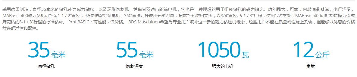 介紹:采用德國制造,直徑35毫米的鉆孔能力磁力鉆床,以及環形切割機,憑借其雙速齒輪箱電機,它也是一種理想的用于扭轉鉆孔的磁力鉆床。功能強大,可靠,內部潤滑系統,小巧輕便,MABasic 400磁力鉆機可鉆至1-1 / 2“直徑,9.5安培雙絕緣電機,3/4”直接刀桿使用環形刀具,扭轉鉆孔使用夾頭,以3/4“直徑; 6-1 / 3”行程,使用1/2“夾頭,MABasic 400可輕松轉換為傳統麻花鉆的6-1 / 3”行程的標準鉆床。 ProfiBASIC:高性能 - 低價格。 BDS Maschinen希望為專業用戶填補這一新的磁力鉆壓機概念,這些用戶不能在質量或性能上妥協,但能夠以優惠的價格放棄舒適性和配件。