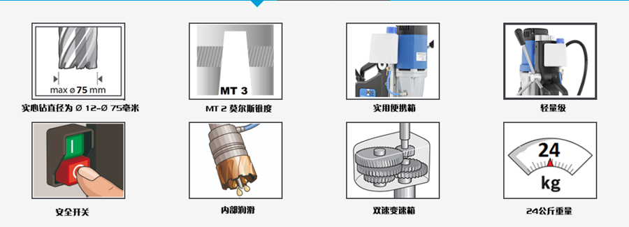 介紹:德國制造的大容量便攜式磁力鉆孔機MABasic 850.MABasic 850便攜式磁力鉆孔機配備強大的16安培電機,可提供230V和110V電壓。 MABasic 850便攜式磁力鉆孔機可以使用傳統的麻花鉆頭進行?3.6/ 16“鉆孔,帶環形切割器,?1-1/ 4”。 MABasic 850配備了Morse Taper 3,易于使用鉆頭MT3。 MABasic 850的行程為10“。這款堅固的便攜式磁力鉆孔機重量僅為53磅.ProfiBASIC:高性能 - 低價格.BDS Maschinen希望通過這種新的磁力鉆壓機概念填補空白,專業用戶不能妥協質量或性能,但誰能夠放棄舒適和配件,以獲得良好的價格。
